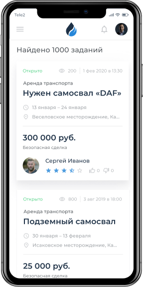 Для удобства поиска исполнителя или заказчика рядом с месторождением интегрирована виртуальная карта с метками и карточками заданий. Для детализации поиска в интерфейсе карты размещен фильтр и ползунок для установки радиуса относительно местоположения.